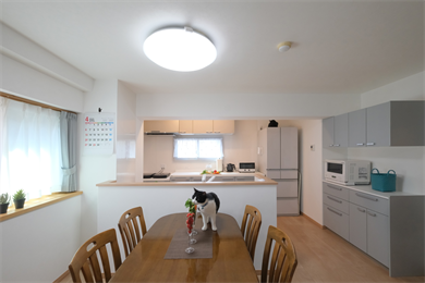 Ⅱ型キッチンとカップボードの設置で、収納力が大幅に上がりました。物が散らからなくなったので掃除も楽々。 猫ちゃんたちもゆうゆうと室内を闊歩できます。