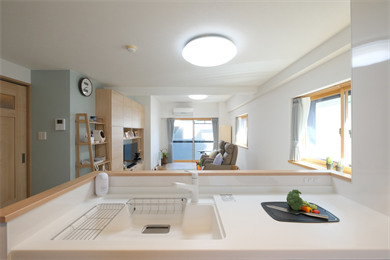 白い人工大理石のシンクは掃除も楽々で、部屋が開放的に見えるのがお気に入り。間仕切りもなくなり、3つの窓から光がたくさん入る明るいLDKになりました。