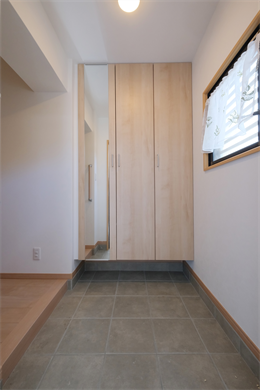 玄関収納の背中側の壁をキッチン側に寄せて、収納をすっぽり埋め込みました。 家具が出っ張らないので玄関が広々使えるようになり、猫のトイレを置いてもゆとりがあります。