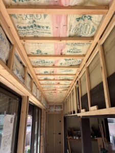 天井壁に下地の木を組み断熱材を入れている所と